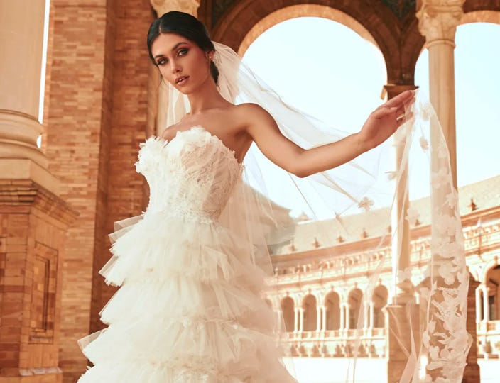 Precisamente este corte más ajustado hasta la rodilla es uno de los más abundantes de la última colección de Pronovias, una de las firmas de referencia en el mercado internacional en lo que al sector nupcial se refiere. Pero no se limita esta marca a los vestidos de corte sirena, sino que el evasé está también en buena parte de sus propuestas.