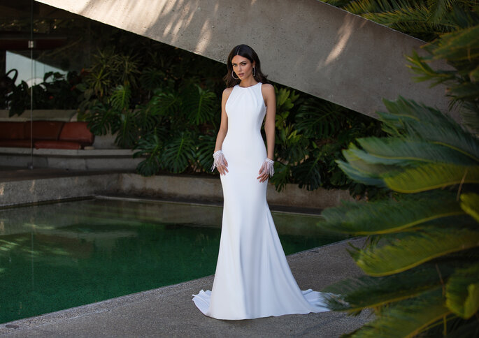En el amplio repertorio de propuestas de Pronovias, hay espacio también para propuestas en clave minimalista. Dentro de su colección Edén, inspirada en la belleza de la naturaleza, diseños como el bautizado como Fumarole se centran en las tendencias de la temporada, siempre con el sello de la casa. “Tras esta excepcional situación que hemos vivido, quería ofrecer a las novias algo de escapismo y una oportunidad para recordar la belleza esencial y el exotismo de la naturaleza”, comentaba Alessandra Rinaudo.