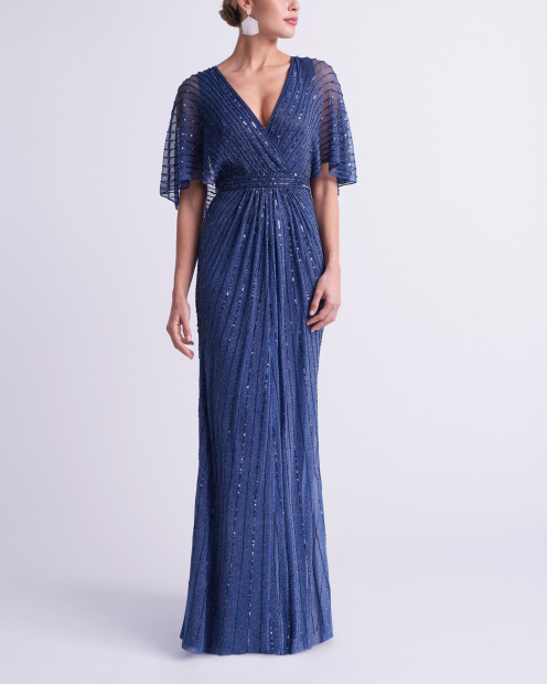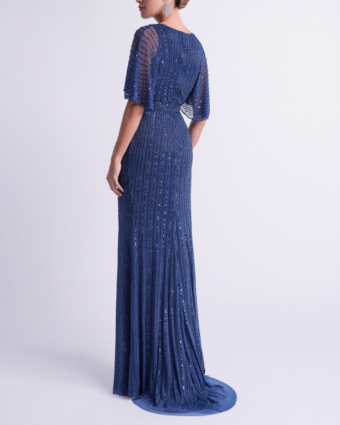 Vestido de fiesta largo elegante de corte recto, confeccionado en tul lúrex con detalle de drapeados en la cintura. Conjunto Cocktail de escote cruzado y espalda acuchillada, con manga corta estilo capa.