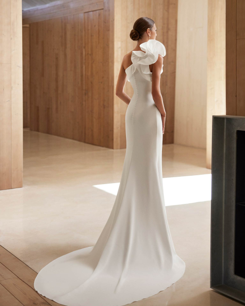 Vestido de novia de corte sirena y estilo romántico, realizado en crepé elástico. Presenta un escote asimétrico y manga con volantes. Un traje de tendencia.