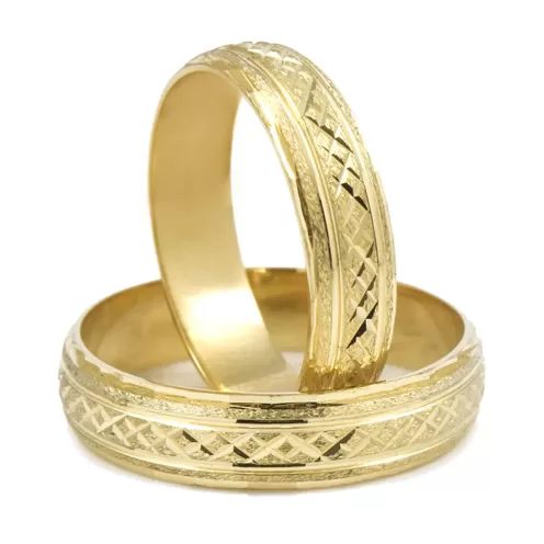 Cada argolla está meticulosamente trabajada, mostrando una serie de patrones geométricos tallados que reflejan tanto la habilidad artesanal como la atención al detalle. El acabado texturizado junto con los bordes pulidos resalta la riqueza del oro, ofreciendo un juego de brillos que captura la luz desde todos los ángulos.
