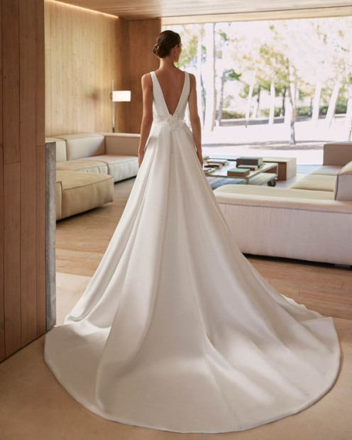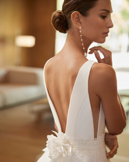 Vestido de novia con silueta en línea A y estilo clásico, confeccionado en Sienna, encaje y pedrería. Se completa con un escote profundo, una espalda en V y una flor de adorno.