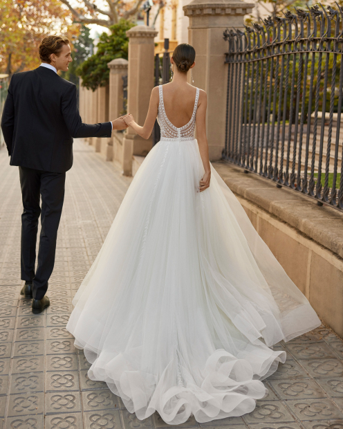 Con Asier, lucirás radiante en tu ceremonia religiosa en primavera. Su corte princesa le da un volumen espectacular a la falda de tul, que combina de maravilla con el cuerpo ajustado y bordado con pedrerías. Incorpora un escote en V, románticos tirantes y una espalda abierta.