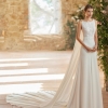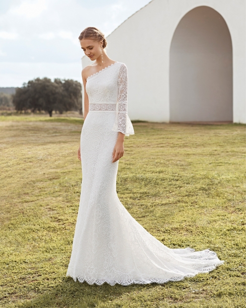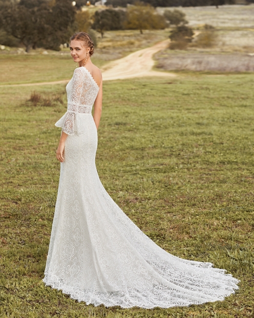 El corte recto de la falda muestra de forma delicada las curvas de la figura y compensa el moderno diseño que presenta el busto, con una manga francesa acampanada y un hombro descubierto. El encaje recorre el cuerpo hasta la espalda, donde el tejido deja vislumbrar suavemente la piel. El estilo boho-chic de este vestido de novia es ideal para disfrutar de una ceremonia en primavera.
