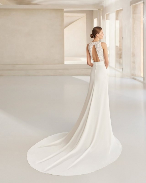 El sencillo escote halter sin mangas enmarca los hombros y atrae la atención hacia el torso. Su espalda descubierta y su cuerpo elaborado con encaje con transparencias combina magistralmente con la falda lisa, presentando una cintura ceñida y una botonadura elegante lateral.