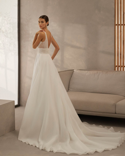 Vestido de novia largo, de estilo clásico, confeccionado en garza combinada con encaje y pedrería. Muestra un escote y espalda en V, tirantes y una falda con abertura lateral. Un look de ensueño.