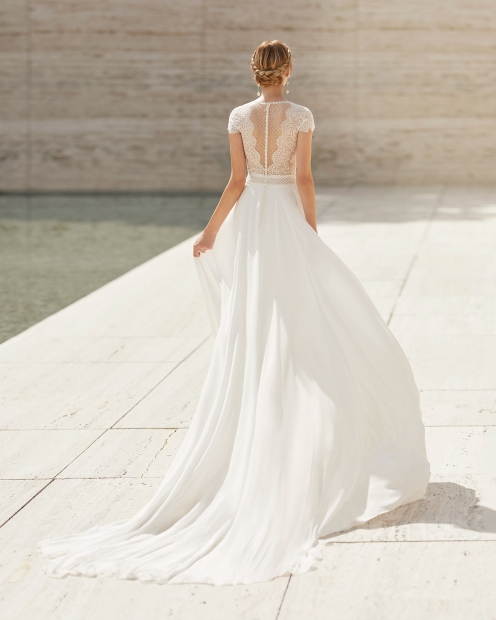 El tejido de gasa desliza la falda con fluidez sobre el cuerpo al caminar hacia el altar y su espalda ilusión presenta un aspecto tan atractivo como la parte delantera, combinando plumeti y encaje. Este vestido de novia es perfecto para dar el “sí, quiero” en una boda civil en primavera.