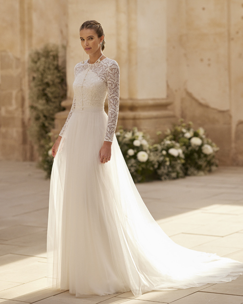 Vestido de novia largo de dos piezas, con silueta en línea A y estilo moderno. Elaborado con crepé fino y espalda descubierta, combina de maravilla con un abrigo de encaje y tul. Luce este exclusivo conjunto Alma Novia.