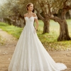 La feminidad de Kaily encandilará a las novias más tradicionales. Este vestido de novia de corte recto y estilo sencillo, confeccionado en crep liso, es puro romanticismo para tu gran día. El escote barco y las mangas caídas transparentes con espalda abierta de tul plumeti, le dan un toque todavía más mágico. Su cola es extraíble.