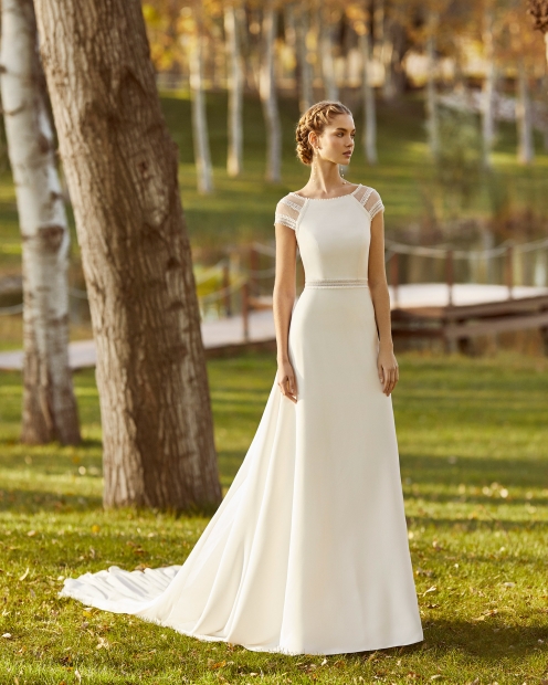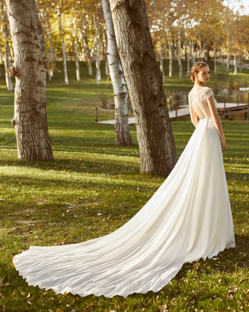 La feminidad de Kaily encandilará a las novias más tradicionales. Este vestido de novia de corte recto y estilo sencillo, confeccionado en crep liso, es puro romanticismo para tu gran día. El escote barco y las mangas caídas transparentes con espalda abierta de tul plumeti, le dan un toque todavía más mágico. Su cola es extraíble.