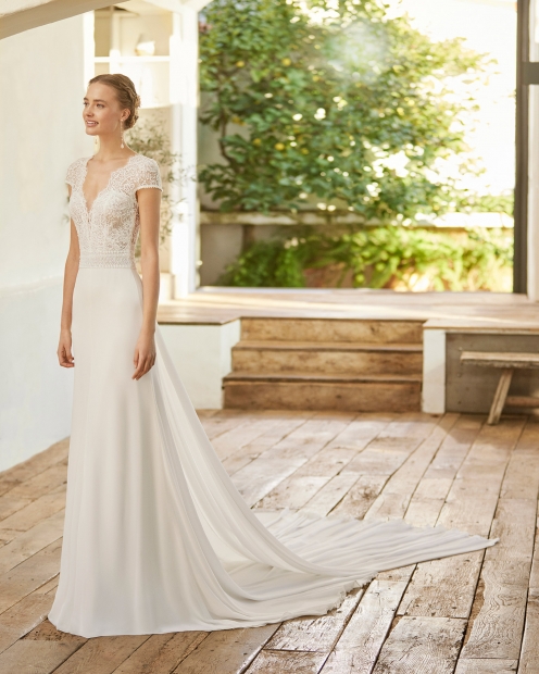 La ligereza de su confección en gasa encandila a las novias que desean sentirse elegantes. Su espalda ilusión con encaje y plumeti es la combinación idónea para las mujeres que buscan un outfit divertido a la vez que sobrio. Incorpora una cola extraíble que será el centro de atención.