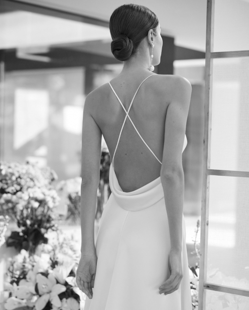 Vestido de novia, de corte recto y estilo fluido. Confeccionado en crepé satén. Con escote v, espalda descubierta y tirantes cruzados. Look Rosa Clará Couture delicado.