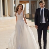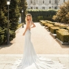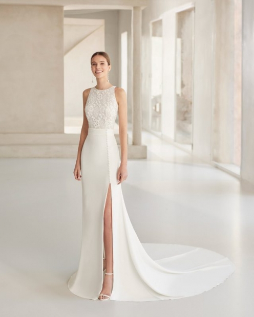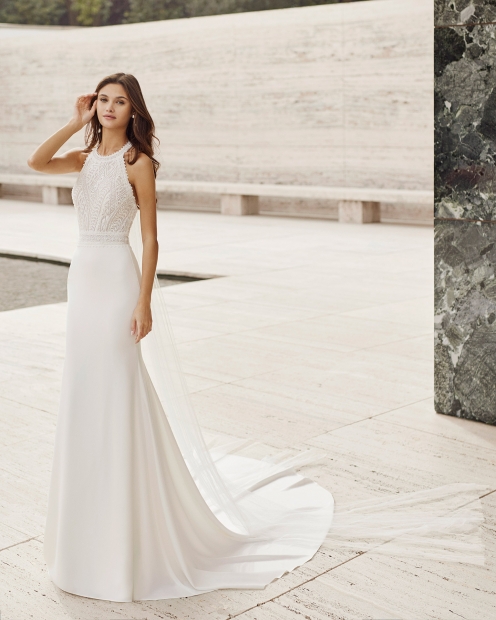 Nao es un gusto para la vista y el tacto. Este vestido de novia de corte recto presenta detalles exclusivos y una ligereza de la que le dota el tejido de crepé en el que está confeccionado. El escote halter le otorga un punto de modernidad y da protagonismo a los hombros, deslizándose hacia la espalda y mostrándola completamente abierta. Su cuerpo de encaje romántico compensa de maravilla la sencillez de la falda que acaba en una delicada cola.