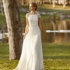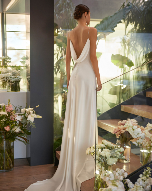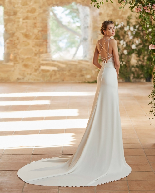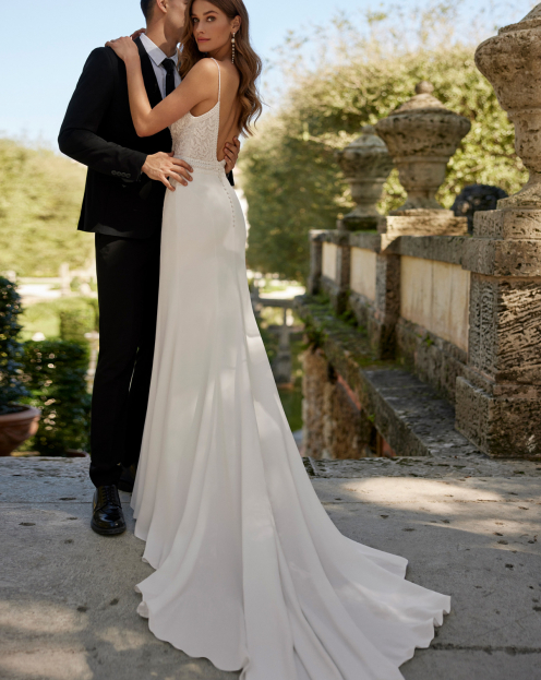 Patma es un diseño de corte recto y escote barco, elaborado en crepé y de estilo boho chic. Te sorprenderá su cuerpo exquisito de encaje y los finísimos tirantes que cruzan su espalda abierta. Siente el movimiento con su capa, que se sujeta en los hombros.