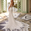Vestido de novia de corte sirena y estilo sexy, confeccionado en crepé combinado con encaje y pedrería. Un escote profundo, una espalda en V, tirantes de pedrería y una falda con abertura delantera completan este outfit de ensueño.