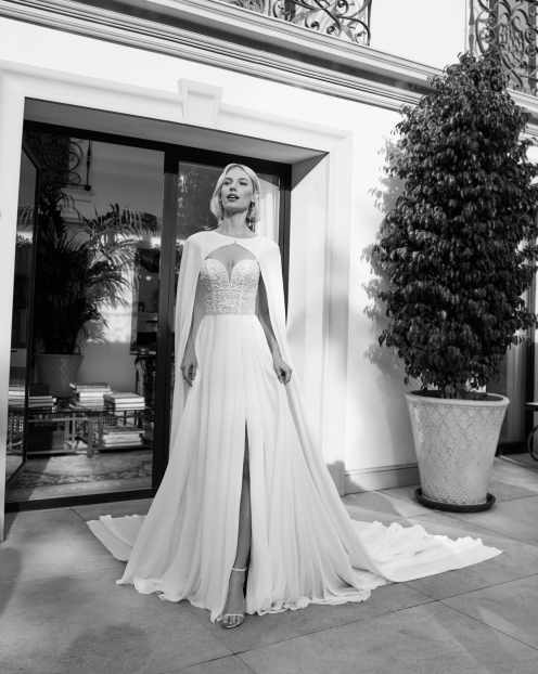 Vestido de novia de corte recto y estilo elegante, confeccionado en georgette enriquecido con pedrería. Muestra un escote corazón, una espalda cuadrada, tirantes de pedrería y una falda con abertura delantera. Un look único