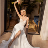 Wang es el vestido de novia ligero que buscas para tu boda en la playa. Presenta un corte recto y un escote de punta que combina a la perfección con los tirantes y una espalda descubierta de estilo boho chic. La falda de georgette es una delicia. Vive al máximo tu boda religiosa en primavera con este traje de encaje y pedrería.
