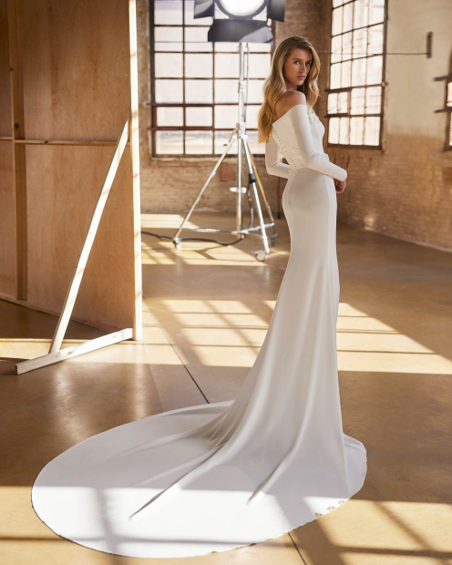 Vestido de novia de corte sirena y estilo romántico, confeccionado en crepé enriquecido con flores de tela. Deslumbra con un escote que deja los hombros al descubierto, manga larga y una falda lisa. Un delicado traje Aire Atelier.